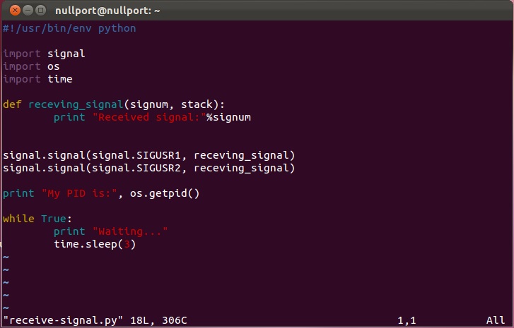 so here you can see i have a little code snippet to generate the signals in my os, here signals are received by establishing a callback function,signal handler, the arguments to your signal handler are the signal number and the stak fram from the point in your program that was inerrupted by the signal. Let's me run this script